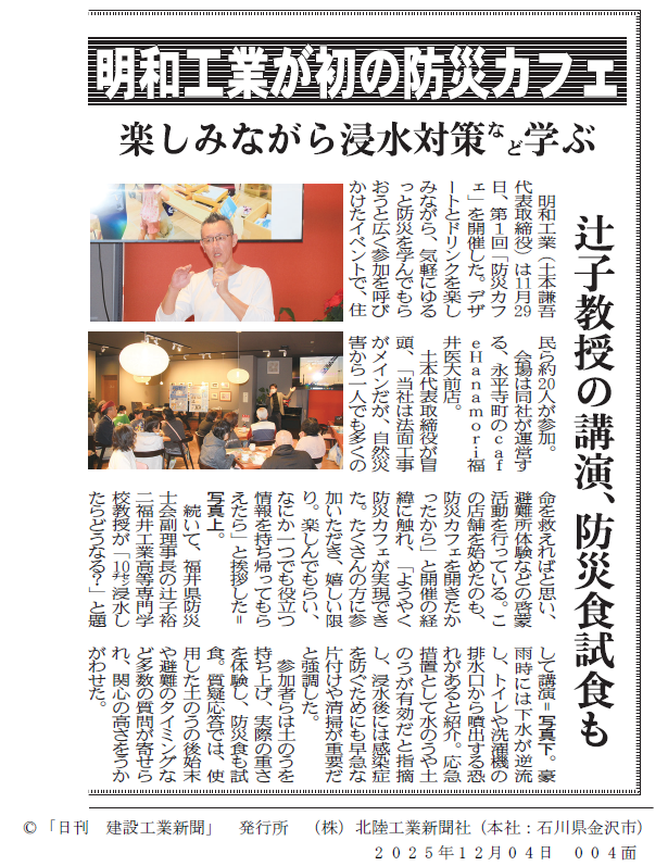 12月4日付の建設工業新聞に、防災カフェ開催が紹介されました。